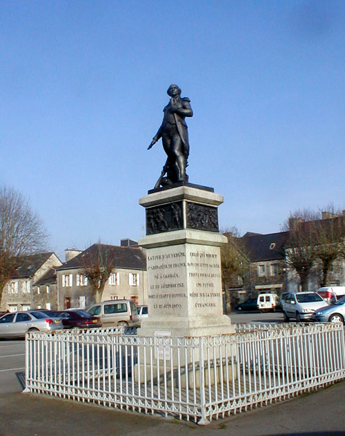 "Carhaix est une ville du Moyen Âge sans attrait; ses rues sont sales et non pavées. Elle a beaucoup perdu de 1'importance qu'elle avait eue comme capitale du pays séparé de la Cornouaille, au VIe siècle, par Comorre, le Barbe bleue breton. Elle est située sur une hauteur d'où la vue s'étend sur le pays aride et monotone qui l'entoure, clôturé par les monts d'Arrée qui sont les Alpes du Finistère. C'est le centre de la basse Bretagne. Le duc d'Aiguillon, ministre de Louis XV, y fit construire six routes qui mènent à Brest, Quimper, Morlaix, Saint-Brieux, Vannes et Châteaulin, dans l'espoir d'introduire commerce et civilisation dans cette région désolée, “le dernier trou du monde", selon les Parisiens. La Tour d'Auvergne, premier grenadier de France, y est né, et une statue en bronze, par Marochetti, lui a été élevée. Il est représenté en uniforme de simple soldat qui presse sur son cœur l'épée d'honneur que vient de lui donner le premier consul. Autour du socle, il y a quatre bas-reliefs, illustrant des scènes de sa vie : dans le premier, on le voit sauver un soldat blessé; dans le second, forcer les portes de Chambéry; dans un troisième quitter les parents d'un jeune homme dont il prend la place comme conscrit; dans le dernier être tué par une lance à Ober-Hausen (Bavière), en se battant contre les Autrichiens. Le monument porte cette inscription sur ses quatre côtés : “La Tour d'Auvergne, Ier Grenadier de France, né à Carhaix le 23 décembre, 1715; mort au champ d'honneur le 27 juin, 1800. Écrivain, Citoyen, Soldat, sa vie toujours glorieusement remplie ne laisse que de sublimes exemples à la postérité. Tant de talents, et de vertus, appartenaient à l'histoire et au premier Consul, de les devancer. Celui qui meurt dans une lutte sacrée trouve pour le repos une patrie même sur la terre étrangère." Préférant le titre de 'Premier Grenadier de France' à de