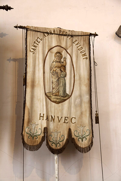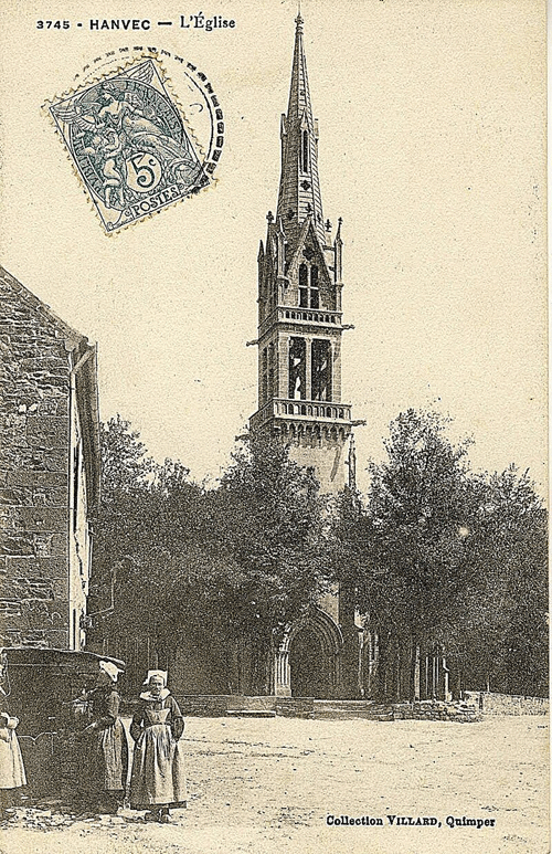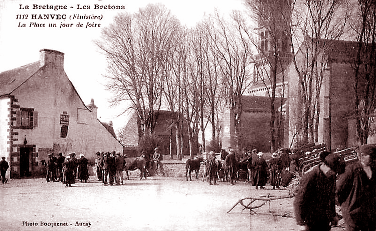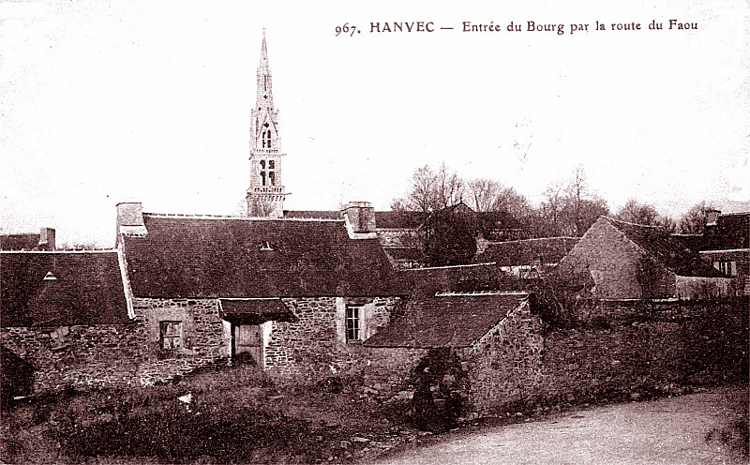 | Histoire / Istor : * Ogée (1780) : Hanvec; à 8 lieues 1/4 au N. de Quimper, son évêché; à 39 lieues 1/2 de Rennes, et à 1 lieue 1/6 du Faou, sa subdélégation. Cette paroisse relève du roi, et compte, y compris ceux de Rumengol et de Lauvoy, ses succursales, 2600 communiants. La cure est à l'Ordinaire, pour un chanoine de Daoulas. C'est un pays plat, où on trouve pourtant quelques vallons, peu de prairies, beaucoup de landes, des arbres fruitiers et quelques bois taillis, dont le plus considérable est celui de Keroliver. Ou y recueille des grains de toute espèce. En 1400, ou connaissait , dans ce territoire, les manoirs de la Roche-Boezien, où demeurait le vicomte du Faou, qui possédait aussi celui de Kercadiou, Quilliazel, Kerliver, Kerausouar, Kerascouet, Nautelon, et celui de l'abbé de Daoulas. [La maison seigneuriale de Mescam, relevant du Faou, appartenait, en 1396, à Olívier de Cornouaille, et, en 1492, à Jean de Quelen.] * Marteville et Varin (1843) : HANVEC (sous l'invocation de saint