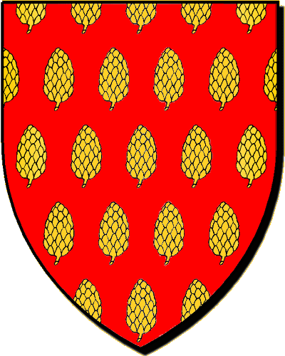"d'azur au chevron d'or, accompagné de trois pommes de pin de même" "en glazur e gebrenn en aour, heuliet gant teir aval-pin ivez en aour" - François, président aux Grands-Jours de Bretagne en 1538, puis président à mortier au Parlement de Bretagne en 1554 - René, président à mortier au Parlement de Bretagne en 1556 - Pierre, conseiller au Parlement de Bretagne en 1565 - René, (le même ?) président à mortier au Parlement de Bretagne en 1570 Une branche fondue en 1697 dans Contades; une autre branche transplantée dans l'Orléanais, y maintenue en 1668 |