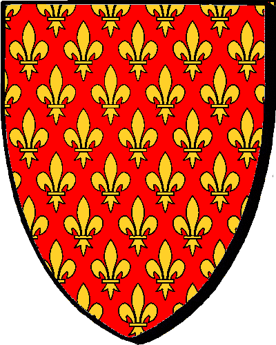 "d'argent à la fleur de lys de gueules" / "en arc'hant e vlourdilizenn en gwad". - Pierre, alloué et lieutenant-général au présidial de Nantes, conseiller au Parlement de Bretagne en 1570 |