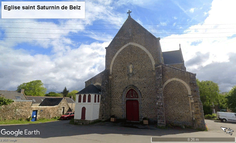 | Histoire / Istor : * Ogée (1780) : Belz (dans Ogée, Betz); à peu de distance de la mer; à 6 lieues 1/3 à l'O. de Vannes, son évêché; à 26 lieues 1/3 de Rennes, et à 3 lieues d`Auray, sa subdélégation. Le roi est le seigneur supérieur de cette paroisse, où l'on compte 1500 communiants. La cure est à l'Ordinaire. Il y a haute-justíce, qui, de la baronnie de Lanvaux, ressortit au siège royal d'Auray. Ce territoire forme un pays plat, fertile en grains, si vous en exceptez quelques vallons où l'on voit des prairies. C'est dans cette paroisse qu'est située l'île de Saint-Cado, ou l'on trouve une chapelle et un passage nommés Saint-Cado. En 563, cette île était habitée par ce saint, qui construisit un pont sur le bras de mer pour passer en terre ferme, dans l'endroit où est maintenant le passage de la rivière d`Ethel. L`île se nommait alors Enes-Cadvod, et l'histoire de ce temps nous apprend qu'elle était remplie de serpents et autres reptiles venimeux, que saint Cado chassa, et que depuis ce temps il n'y en a paru d'aucune espèce. Belz renferme les maisons nobles suivantes : les manoirs de Keralain et de Manéguégant, en 1250, à Pierre de Rosmadec; celui de Keriargou [Kerjargon], à Jean Guimarho [Jean Guy Marho]. * Marteville et Varin : BELZ (sous l'invocation de saint Saturnin, évêque et martyr; Pagus de Beels dans D. Morice, Preuves, t. I, col. 34), commune formée de l'anc. par. de ce nom, aujourd'hui cure de 2è classe; chef-lieu de perception; brigade de gendarmerie temporaire. Limit. : N. et O. marais qui la séparent de Locoal-Mendon et de Plouhinec; E. Mendon; S. Erdeven. Princeip. vill. : Saint Cado, Kerguerhan, Kerlourde, Kerlutu, Kercadoret, Kervoine, Crubelz, Kerargon, Kerdonnaire, Kergatan, Kerantré, Queubernau, Manniatan, Kerquinno, le Bodéac, le Cordie, le Puzic. Superf. tot. 1585 hect. 95 a., dont les princip. divis. sont : ter. lab. 699; prés et pat. 121; bois 15; verg. et jard. 19; landes et incultes 677; étangs 15; sup. des prop. bat. 11; cont. non imp. 30. Moulins à eau du Sac, de l'Oie.