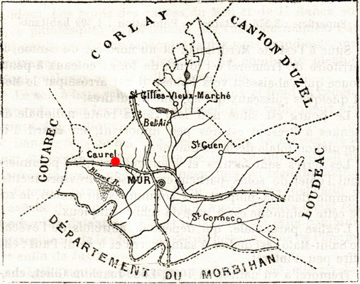 renseignements cadastraux). A 2 kilom. du bourg est une jolie chapelle qui a pour patron saint Golven, évêque de Léon. Cette chapelle est de 1668, et l'on pense que l'église paroissiale est de 1654, époque à laquelle remontent les registres de paroisse. La dîme était autrefois par moitié au roi et à l'abbaye de Bon-Repos. Sur les confins de la commune, du côté qui touche Saint-Mayeux, il y a un menhir, haut d'environ 3m hors de terre. Les ardoisières sont une des ressources de cette localité; la principale, qui est située sur le bord du canal de riantes à Brest, est exploitée par plus de 80 familles. Chaque semaine elle exporte, de février à novembre, plus de 60,000 ardoises. Cette belle ardoisière est la propriété de trois villages qui l'entourent, et tout habitant de ceux-ci a le droit d'y travailler pour son compte. Bien dirigée en commun, cette exploitation serait un immense produit pour cette petite localité. On remarque en Caurel une futaie, qui est, dit-on, admirable; elle se compose d'environ 300 hectares de chênes, fort anciens et fort beaux. Géologie : phyllades tégulaires; schistes argileux. On parle le breton. ------------------ * Anonyme (1863) : CAUREL, 753 hab.; bornée au N. par Saint-Mayeux; à l'E. par Saint-Gilles-Vieux-Marché et Mûr; au S. par le canal de Nantes à Brest, qui la sépare du Morbihan; à l'O. par Saint-Gelven; traversée par la route impériale N° 164 bis, et dans l'E. par la route impériale No 167; réunie à Mûr pour l'instruction des garçons, 14 élèves; dépend de la perception de Mûr; ancienne trêve de Saint-Mayeux; on parle le breton. Le territoire de cette commune est très-accidenté; ses terres sont légères; elles seraient assez productives, si on les cultivait avec plus de soin. Quant au bois dit de Caurel, il n'a qu'une étendue d'environ 200 hectares, couverte en majeure partie de chênes fort anciens. L'agriculture est l'industrie principale de la commune. Cependant l'exploitation des ardoisières, qui produisent environ 1,500 à 1,800 milliers d'ardoises par an, occupe 90 ouvriers. Le canal sert à exporter une grande partie de ces matériaux. L'église, sous le patronage de la sainte Vierge, appartient au XVIIè siècle. Une jolie chapelle qui date de 1668, dédiée à saint Golven, évêque de Léon, se trouve à 2 kilom. du bourg. Menhir auprès du village de Belair. La principale ardoisière de Caurel a de 63 à 70 m. de profondeur. Points culminants : Kerven (sur les bords du canal, 182 m.; Corncoat (signal), 309 m.; Saint-Golven (chapelle), 213 m. Géologie : Schiste ardoisier exploité; au sud et au nord, grès. Maires : Ont successivement rempli ces fonctions, MM. Audren, Jegoux, Guilloux, Quinio et Le Marchand, maire actuel. ------------------ * Régis de Saint-Jouan : "Sa première municipalité fut élue le 7 février 1790". ------------------ * Éditions Flohic : "Sous l'Ancien régime, Caurel est une trève de Saint-Mayeux. ------------------ Maires de Caurel, MMrs : AUDREN, JEGOUX, GUILLOUX, QUINIO; LE MARCHAND (1863),... |