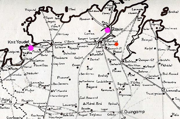 Sources : * Ogée : Dictionnaire historique et géographique de la province de Bretagne, dédié à la Nation bretonne, vers 1780; * A. Marteville et P. Varin : continuateurs d'Ogée, avec corrections et mises à jour adaptées à la situation post-révolutionnaire. 1843. * Adolphe Joanne : Département des Côtes-du-Nord. Hachette. 1878. * Adolphe Joanne : Dictionnaire des communes du département des Côtes-du-Nord. 1886. * J. Rigaud : Géographie historique des Côtes du Nord. 1890. - Frotier de la Messelière : De l'age probable des châteaux de terre, dans Société d'Émulation des Côtes-du-Nord, n° LXV 1933. - René Couffon : Recherches sur les églises primitives, dans Société d'Émulation des Côtes-du-Nord; n° LXXV 1945-1946. * Alain Le Diuzet : Voies romaines en Côtes du Nord. Mouez ar Vro. 1960. * Albert Dauzat et Charles Rostaing : Dictionnaire étymologique des noms de lieux en France. Librairie Guénégaud. 1963-1978. * Roparz Hémon : Dictionnaire français-breton. Al Liamm. 1978. * Régis de Saint-Jouan : Dictionnaire des communes du département des Côtes d'Armor. 1990. * Bernard Tanguy : Dictionnaire des noms de communes, trèves et paroisses des Côtes-d'Armor. Chasse-Marée - Ar Men. 1992 * Erwan Vallerie : Diazezoù studi istorel an anvioù-parrez. Corpus. An Here. 1995 * Éditions Flohic : Le patrimoine des communes des Côtes-d'Armor. 1998. - Edmond Rébillé : Itinéraire littéraire en Côtes d'Armor. Coop Breizh. 1998. - Jean Maguer : Kanton ar Roc'h. Petite histoire du canton de La Roche-Derrien. Impram. Lannion. 1999. * Hervé Abalain : Les noms de lieux bretons. Universels Gisserot. 2000. * Daniel Delattre : Les Côtes d'Armor; les 372 communes. Éditions Delattre. 2004 |