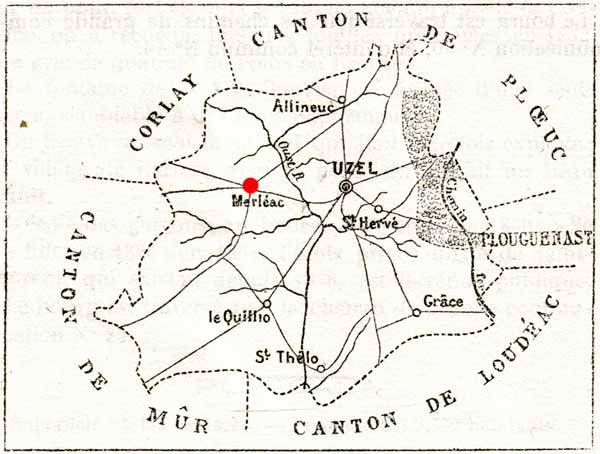 | Histoire : * Ogée (vers 1780) : Merléac; sur une montagne; à 21 lieues à l'E.-N -E. de Quimper, son évêché [aujourd'hui Saint-Brieuc]; à 19 lieues 1/3 de Rennes, et à 2 lieues 1/2 de Quintin, sa subdélégation. Cette paroisse ressortit au siège do Ploërmel et compte 4000 communiants, y compris ceux de Quilio*, sa trêve. La cure est présentée par le grand- chantre de l'église cathédrale de Quimper. La rivière d'Oust prend sa source dans ce territoire, et va tomber dans la Vilaine au près de Redon. Le pays est couvert d'arbres et buissons, et renferme des terres fertiles en grains et quelques landes; les habitants font beaucoup de cidre. En 1411, le prévôt de Merléac rapporta un acte entre Olivier le Fieuz, Jacques le Gal et autres, qui vendirent à Olivier, vicomte de Rohan, plusieurs biens qu'ils possédaient en cette paroisse. Jean Validire, dit de Saint-Léon, naquit à Merléac en ... Il fut d'abord confesseur du duc Jean V, puis évêque de Saint-Pol-de-Léon, et transféré, à celui de Vannes en 1443. Il fit bâtir une chapelle en l'honneur de saint Léon, qui, depuis ce temps, est devenue trêve de cette paroisse*. Les jurisdictions et maisons nobles sont : Le Houl, haute, moyenne et basse-justice, à M. du Bouexic de Pigneux; le Vaugaillard, haute, moyenne et basse-justice, au même; le Quellenec, moyenne et basse-justice, à M. de Cohediquel : elle s'exerce à Saint-Ermoët; le Rox, moyenne et basse-justice, à M. Cecy de Kerampuil; Kerjacob, maison noble qui appartient aux seigneurs de Quellenec. * Marteville et Varin (1843) : MERLEAC (sous l'invocation