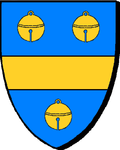 Références de 1427 à 1448, dite paroisse de Léon. "d'azur à la fasce d'or, accompagnée de trois grelots de même" "en glazur e dreustell en aour heuliet gant tri c'hrizilhon ivez en aour" Devise / Sturienn : Aime Dieu. - Jean, évêque de Léon en 1436, chancelier de Bretagne en 1445, évêque de Saint-Brieuc en 1450 (PPC) |