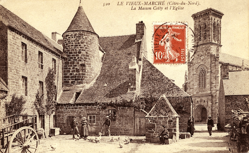 | Histoire /Istor : " Le Vueil-Marché est qualifié en 1433 de "ville marchande et bien fondée" (cf. Flohic) Siège du canton de Plouaret, de 1790 à 1802; Précédemment trève de Plouaret, Le Vieux-Marché est érigée en paroisse en 1860 La commune du Vieux-Marché a été distraite du territoire de Plouaret le 30 mai 1866. * Bernard Tanguy : "Devenue commune en 1 866, Le Vieux-Marché demeura une trêve de Plouaret jusqu'en 1860, date de son érection en succursale. L'importance du lieu est pourtant manifeste dès le XIVe siècle, puisqu'il figure, aux côtés de Rosporden, à titre de ville dans la dotation du duc Jean III en faveur de son fils naturel. Un siècle plus tard, en 1433, il est qualifié de "ville marchande ancienne et bien fondée"; il s'y tient alors, outre un marché hebdomadaire, trois ou quatre foires l'an, dont une le jour de la Saint-Pierre. Cette vocation commerciale ne s'est pas démentie avec le temps, puisque la localité était au siècle dernier le théâtre de onze foires l'an. Si sa situation sur l'ancienne voie romaine de Carhaix à Lannion n'y est pas étrangère, on ne saurait dire à quelle époque elle remonte. Outre un puits funéraire au bourg, on a signalé un établissement romain en face de la chapelle de Bon-Secours et une trouvaille de monnaies romaines au Castel, nom qui rappelle la présence d'une ancienne motte féodale, à laquelle se réfère aussi le lieu-dit Ar Goz-Sal "le vieux château". |