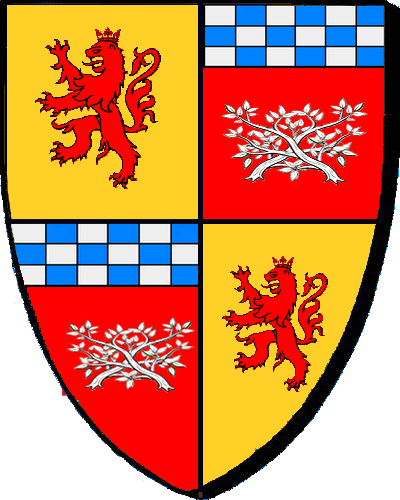 Famille d'Acigné : Texte de Pol Potier de Courcy; adaptations mineures et traduction bretonne par J.-C. Even, Seigneurs dudit lieu, en Vitré; de la Lande et de la Grézionnaye, en Guichen; vicomtes de Coëtmen, en Tréméven; vicomtes de Tonquédec; seigneurs de Montjean en Anjou; de Fontenay, en Chartres; vicomtes de Loyat; barons de Malestroit; vicomtes de la Bellière, en Pleudihen; de Châteauloger en Saint-Herblon; de Cramou, de Beaumont, de la Couppaye, en Comblessac; de Cottouët; comtes de Combourg; barons de Châteaugiron; d'Amanlis; de Sillé-le-Guillaume, au Maine; de Chollet et de Bécon, en Anjou; barons de La Roche-Jagu, en Ploëzal; comtes de Grandbois, en Landebaëron; seigneurs de Troguindy, en Penvénan; de la Touche-à-la Vache, en Créhen; de Carnavalet, ou Kernévénoy, en Quemper-Guézénnec; de Carnabat, en Plouisy; du Bois-Joli, en Chauvé; de la Motte au Vicomte, en le Rheu; de la Villemario, en Saint-Quay; de Kervenniou et de la Ferté, en Plouigneau; de Keruzec, en Pleumeur-Bodou; de la Villequéno. Anc. ext. chev. réf. 1670, dix-sept gén. réf. et montres de 1426 à 1543, par. d'Acigné et du Rheu, év. de Rennes, Guichen et Loyat, év. de Saint-Malo, Chauvé, év. de Nantes, Saint-Quay, év. de Dol, Ploëzal, Penvénan et Landébaëron, év. de Tréguier. "d'hermines à une fasce alesée de gueules chargée de trois fleurs de lys d'or" "en erminoù, e dreustell divouedet en gwad karget gant teir flourdilizenn en aour" Devise / Sturienn : Necque terrent monstra. - Hervé, témoin d'une donation du duc Alain III, au mont Saint-Michel en 1040; - Alain, prend les armes en 1205 pour venger la mort du duc Arthur; - Georges, porte trois molettes sur un sceau de 1321 ; - Jean, combat glorieusement à la bataille de Nicopolis en Turquie, en 1396; - Pierre, frère du précédent, grand sénéchal de Provence, attaché à la personne de Louis, comte d'Anjou, qu'il accompagna à la conquête de Provence et à celle des royaumes de Naples et de Sicile, mort en 1416 ; - Amaury, évêque de Nantes, en 1462, mort en 1477 ; - Jean, à la bataille de Pavie en 1524; - Louis, évêque de Nantes et abbé du Relecq, mort en 1542; - François, frère du précédent, abbé de Beauport en 1540 ; - autre François, tué à la bataille de Moncontour en 1579 ; - Charles, abbé de Coëtmalouen en 1636. La seigneurie d'Acigné a été érigée en marquisat l'an 1609 en faveur de Charles de Cassé-Brissac, second fils de Charles, maréchal de France, marié en 1573 à Judith, dame d'Acigné. Ce marquisat appartenait en 1637 à Julien Freslan, sieur de la Freslonnière, président à mortier et son arrière-petite-fille l'apporta en mariage, l'an 1710, aux Talhouët de Bonamour. La branche de Grandbois s'est fondue en 1684 dans les ducs de Richelieu; celle de Carnabat dans Coatrieux, puis Jehan de Launay. |