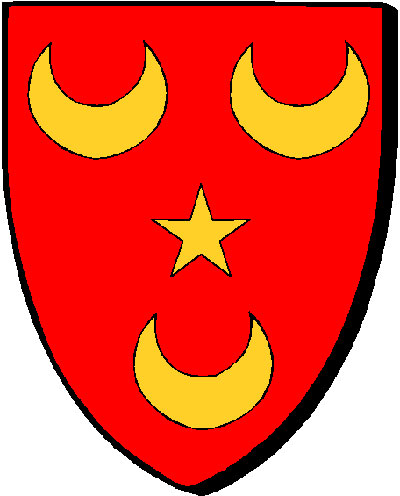 Famille de Trégouet : "de gueules, à trois croissants d'or, une étoile de même en abîme / en gwad, e deir greskenn en aour, (e)ur steredenn ivez en aour ouzh kondon" |