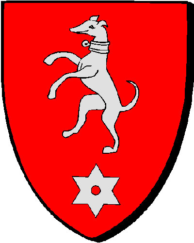 Famille de Trémaudan : "de gueules, à la levrette d'argent, accompagnée en pointe d'une molette de même / en gwad, e c'hadgiez en arc'hant, heuliet ouzh beg gant (e)ur valvaen ivez en arc'hant" |