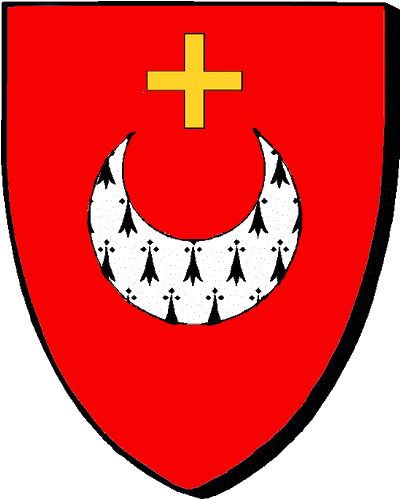 "d'argent à la croix fleurdelysée de sable" / "en arc'hant e groaz flourdiliziek en sabel" - Julien, épouse vers 1518 Guyonne Chaudemanche, dont : - François, gentilhomme servant du roi François Ier, marié en 1545 à Louise du Bellay, aïeul de René, chevalier de Malte en 1610. Les seigneurs de Roscumunec, paroisse de Plouarzel, de même nom et armes, sont établis en Bretagne depuis Pierre, marié en 1658 à Marie Guimarc'h, dame de Kerambellec, de la paroisse du Conquet-Lochrist. |